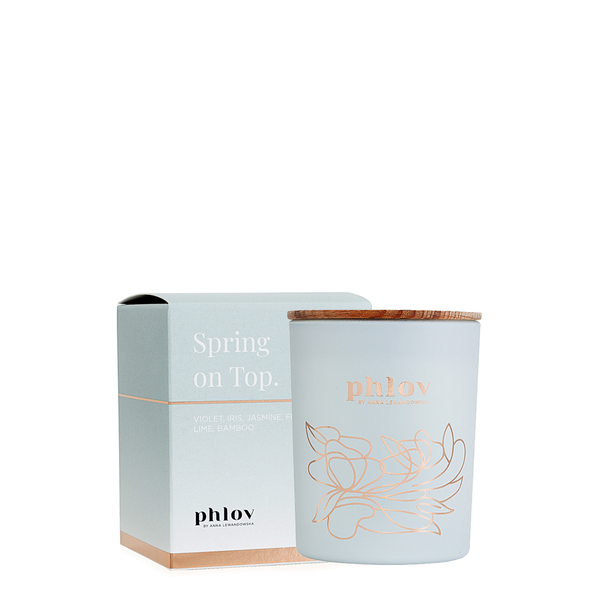 The Spring on Top candle has a natural, cotton wick and a glass jar in an elegant subtle gray color with gold details. The wooden lid can be used as a candle holder for a burning candle.